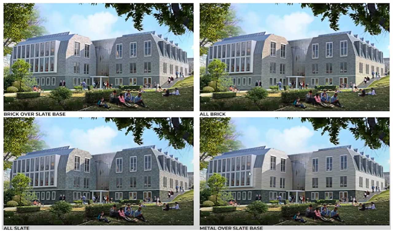 With construction costs on the rise, The Jones Library Building Committee (JLBC) has been presented with four different options for external “cladding” of the planned library addition, each expected to come in at a different cost point. On June 7 Finegold Alexander Architects (FAA) showed renderings of the addition clad in all brick, all slate, brick over a slate base and metal over a slate base.