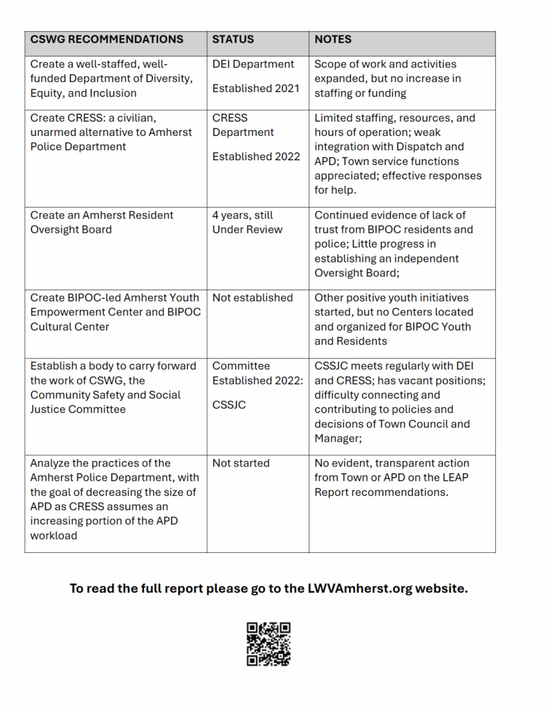 The report states, “Four years have passed since the CSWG completed their work and issued their report. With the League’s position in support of racial equity in mind, we believe it is an appropriate time to review the progress our town has made towards implementing these recommendations. While the CSWG focused on our BIPOC neighbors, in response to national events in 2020-2021, the current federal ICE policies targeting immigrants for deportation extend the relevance of this work to our immigrant neighbors as well. Indeed, providing a safe and equitable community for every person who visits or lives in Amherst should be our town’s priority.”