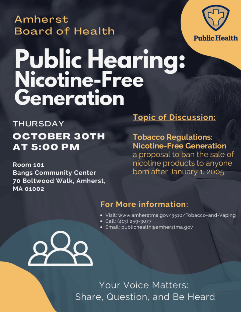 The Amherst Board of Health invites the community to participate in a public hearing on Thursday, October 30, 2025, at 5:00 pm in Room 101 at the Bangs Community Center (70 Boltwood Walk), regarding the proposed addition of a Nicotine-Free Generation provision to its tobacco regulations