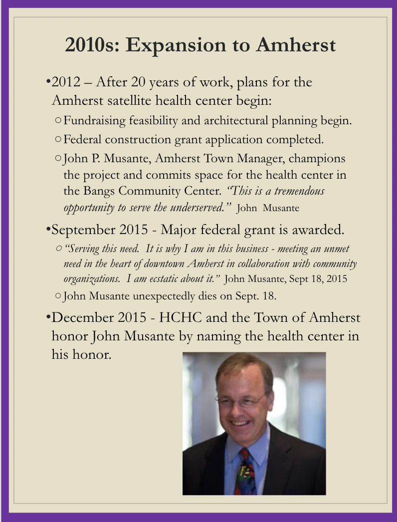 HCHC and its Amherst office are indeed the metaphorical “sweaters and blankets” we need in this challenging time for our country and for healthcare specifically. I met Kilo Malin, Amherst’s Public Health Director, at the anniversary event and she stated: “We are so fortunate to have a community health center in the same building as the Public Health Department and other Town services. We refer people almost every day to the John P. Musante Health Center and have actively partnered with Musante staff on events, training sessions and projects. There are undoubtedly many more rich opportunities for further connection and collaboration! “