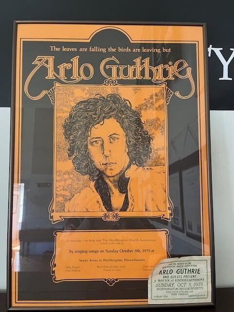 Nancy Gilbert recalled going to the concert, held on October 5, 1975, that was attended by 8,000 people and raised about $18,000. A couple of the original posters advertising the event were on display inside the historical society where one could read “The leaves are falling and the birds are leaving but Arlo Guthrie is staying to help out by singing songs…..bring sweaters and blankets.”