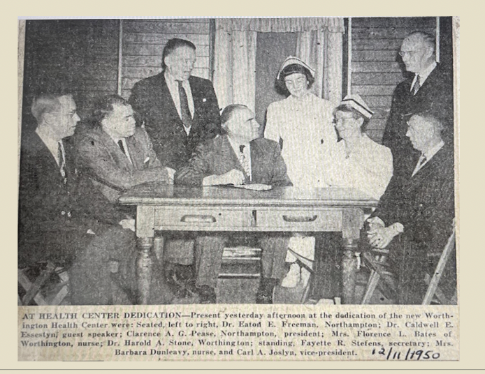 The organization began in 1950, founded by Florence Berry Bates (1892-1973) who trained as a nurse at Cooley Dickinson Hospital at the end of World War I. She became involved with the Red Cross ambulance service (founded in 1922) and rural visiting nurses programs operating in the area. Along with other stakeholders (shown in the 1950 photo from the Daily Hampshire Gazette below), Nurse Florence Bates recognized the urgent need for permanent healthcare in the rural hilltowns. When there appeared to be no doctor available to serve the Worthington area in the 1940s, she helped to launch the Worthington Health Association, incorporated in 1950, laying the foundation for what would become an enduring community institution. “They [ran] a rural nursing service with one nurse serving Cummington, Goshen, Plainfield, Chesterfield, and Worthington. [Over time the] practice extended to Peru and Ashfield as well.”