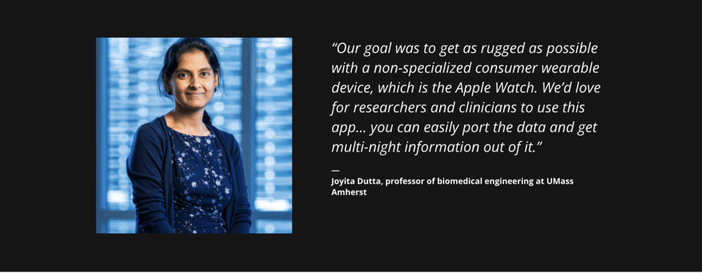 “Our goal was to get as rugged as possible with a non-specialized consumer wearable device, which is the Apple Watch,” says Dutta, Professor of Biomedical Engineering in the Daniel J. Riccio Jr. College of Engineering and senior author of the research, published in IEEE Transactions on Biomedical Engineering. She envisions researchers can use this app to monitor people with sleep disorders at home, without costly lab-based sleep studies.