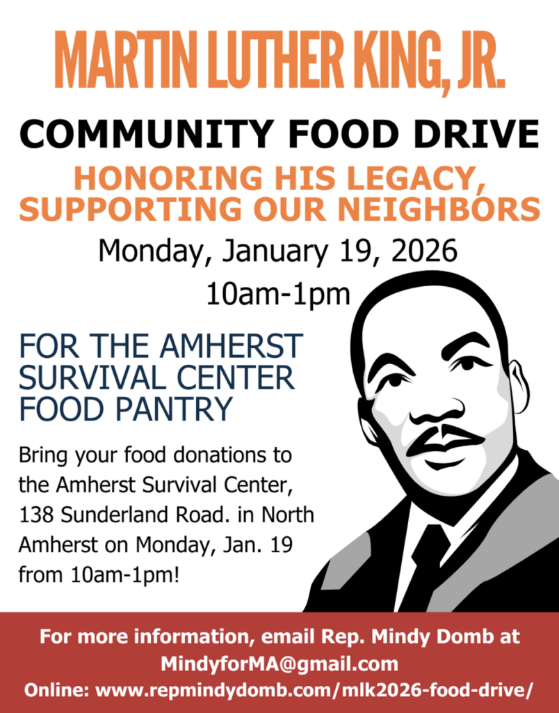 The Second Annual Light and Love Amherst Community Food Drive, organized by State Representative Mindy Domb (D-Amherst), will be held on Martin Luther King Jr. Day, Monday, January 19, 2026, to benefit the Amherst Survival Center. The food drive is inspired by Dr. King’s words: “Darkness cannot drive out darkness; only light can do that. Hate cannot drive out hate; only love can do that.”