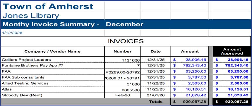 The Town of Amherst received seven invoices totaling $920,057.28 in December. The largest was from general contractor Fontaine Brothers for $782,343.
