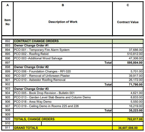 The Fontaine invoice included $35,223 billed for “change order” work outside of the construction contract. Handling of an unanticipated slab in the garden level, revisions to the book drop design, and demolition of two ceilings found to contain asbestos were part of this change order.