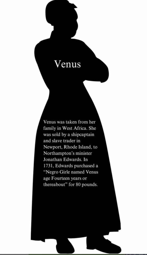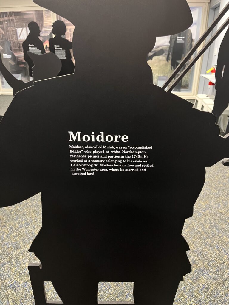 At Historic Northampton, the exhibit’s designers have chosen to tell the story of early Northampton residents through silhouettes of men, women, and children who were enslaved in Northampton. These silhouettes are slightly larger than life-sized and do several things. They immediately act to put you in a relationship with the people who are named and also offer another way to learn about each person alongside written documents (that were biased against enslaved people).