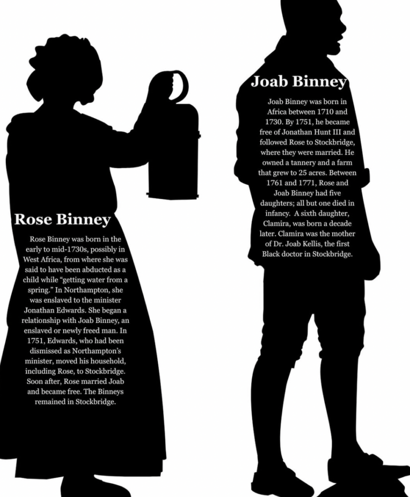 Venus was sold by a ship’s captain and slave trader in Newport, Rhode Island to Northampton’s minister Jonathan Edwards. The documents reveal that in 1731, Edwards purchased a “Negro Girle named Venus age Fourteen years or thereabout” for 80 pounds. Similarly, we meet Rose Binney, born in the early to mid-1730s, possibly in West Africa, from where she was said to have been abducted as a child while “getting water from a spring.” In Northampton, like Venus, she was also enslaved to the minister Jonathan Edwards. There she began a relationship with Joab Binney, an enslaved man who later became free. In 1751, Edwards, who had been dismissed as Northampton’s minister, moved his household, including Rose, to Stockbridge, MA. Soon afterwards, Rose married Joab and became free herself. The Binneys were to remain in Stockbridge for the rest of their lives.
