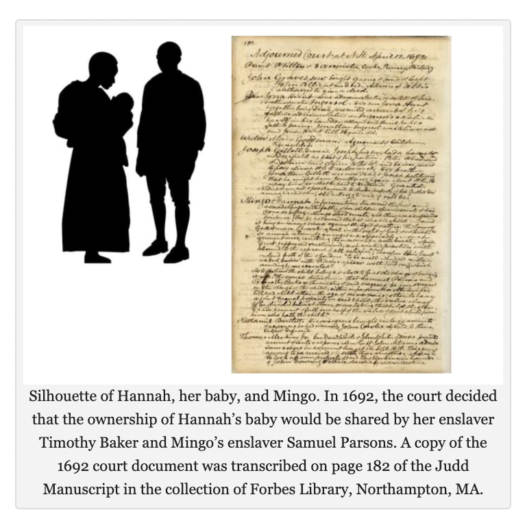 Hannah, her baby, and Mingo (Design Division, Inc., 2025) and a copy of the 1692 court document that was transcribed [from page 182] of the Judd Manuscript in the collection of Forbes Library, Northampton, MA. [The image can also be found at this link [https://enfilade18thc.com/2025/08/26/exhibition-slavery-and-freedom-in-northampton-1654-1783/].