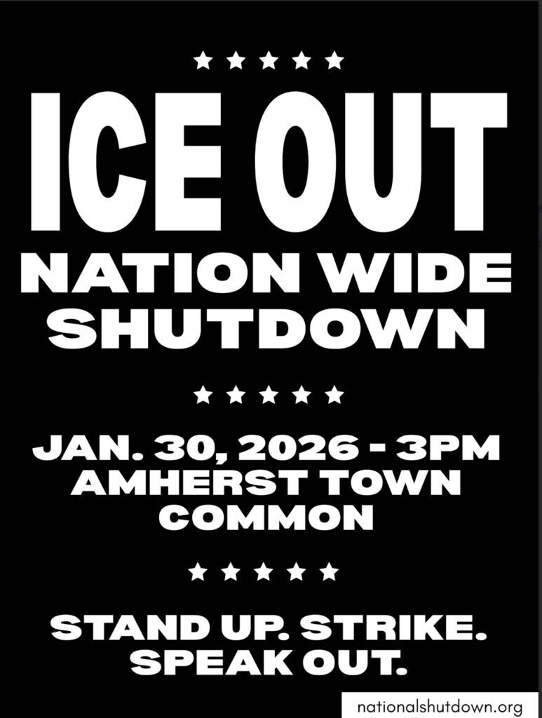The Amherst College Democrats are organizing an ICE Out Protest to be held on the Amherst Town Common, Friday, January 30, at 3 p.m. This action is part of a nationwide general strike, called in response to recent federal ICE enforcement actions, and is meant to bring the community together to raise awareness and show solidarity.