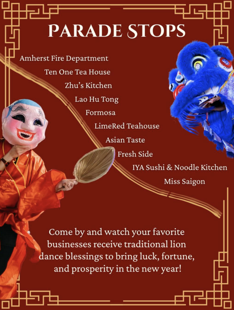 The celebration will feature traditional lion dances performed throughout downtown Amherst, with stops at several Asian restaurants. Lion dance is a centuries-old cultural tradition believed to bring good luck, prosperity, and positive energy for the coming year. Community members, families, and visitors are invited to experience the sights, sounds, and movement of the lion dances as they travel through downtown, blessing local businesses and spreading festive cheer.