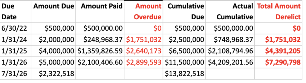 The last cash flow analysis for the project was provided in November 2023, when the Library approached the Town Council seeking an additional ~$10 million. The Town Manager promised the Town Council an updated analysis a year ago, when the Town Council reconsidered whether the project should move forward. The following table summarizes the promises made by the library in the original cash flow that was incorporated into the MOU. Also provided are the actual payments made to the town. Not shown is a recent payment of ~$1 million, which brings the total amount that the library is arrears to over $6 million.