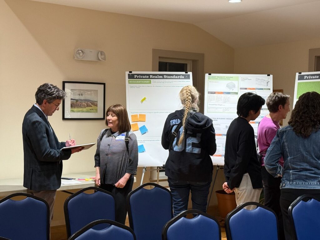 Consultants Peter Flinker, Dillon Sussman, and Nate Burgess from Dodson Flinker devoted the first part of the meeting to summarizing the findings in each volume. Attendees were then invited to visit three stations where they had a chance to chat with the consultants, Economic Development and Planning Director Jeff Bagg, Housing Coordinator Greg Richane, Town Manager Paul Bockelman, Town Councilors Cathy Schoen, Pam Rooney, and Jennifer Taub, and Planning Board Chair Doug Marshall as well as members of the working group. Sussman asked attendees to indicate aspects of the guidelines that they liked and didn’t like on a chart provided for that purpose and to leave specific comments on sticky notes. The room quickly came to life as lively discussions broke out at each station.