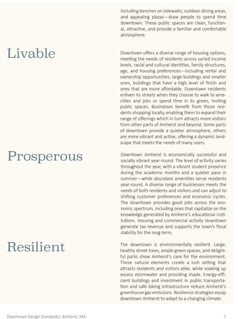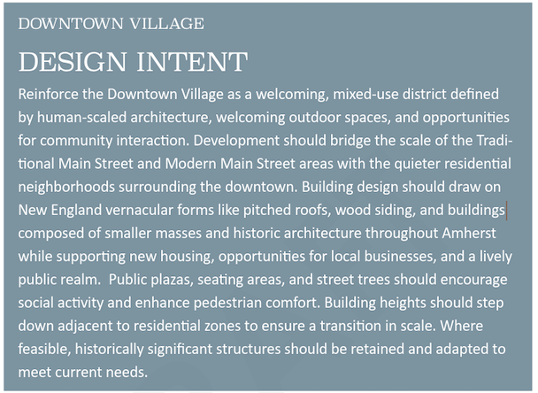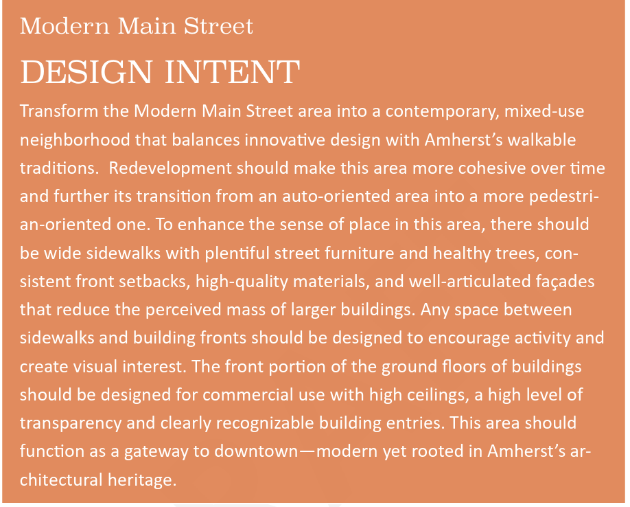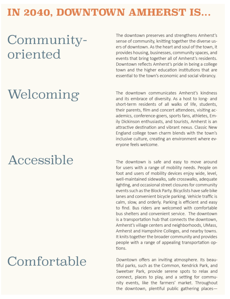 Based on community feedback, the consultants developed the following vision for Amherst in 2040, which guides the proposed design standards.
