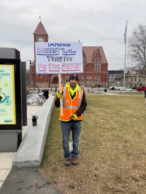 The Amherst DPW Workers Association (ADPWA) announced at a rally on the town’s North Common on March 19 that the town and the union are nearing an agreement on a new contract. ADPWA President Andrew Brace described the last bargaining session as “the most productive meeting that we have ever had.” He said he hopes to have something finalized soon. An agreement would conclude 17 months of on-and-off negotiations, which began in November of 2024. DPW employees have been working without a contract for the past eight months. The union seeks redress for low wages, understaffing, and unsafe working conditions.