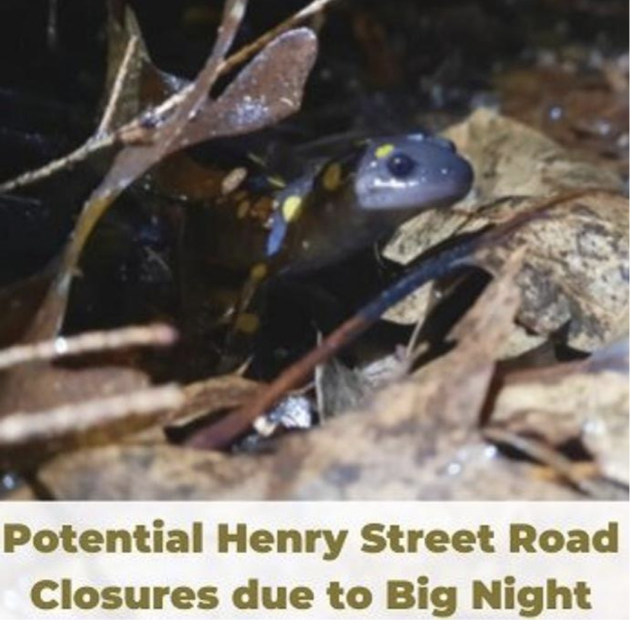 • Henry Street separates salamanders and other amphibians from vernal pools (small temporary ponds) and other wetlands where they migrate every spring to mate and to lay eggs. On Big Night, amphibian mortality can be especially high on roads as amphibians cross in search of their resident vernal pools. The salamander tunnels on Henry Street serve to shepherd the amphibians safely from the uplands on the east side of Henry Street, to the vernal pools to the west. During Big Night, volunteers gather in the area to aid amphibians’ safe crossing.