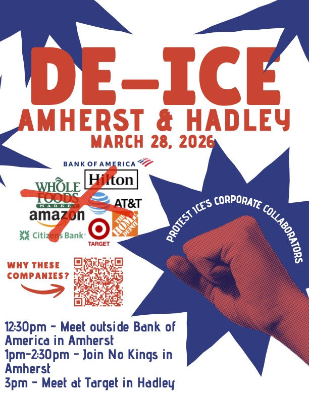 Following many local No Kings rallies and Saturday March 28, an alliance of local students and Show Up, Sing Out! Singers will lead a tour of seven “corporate collaborators” of ICE. They will march, chant and sing to draw attention to their demands: STOP COLLABORATING WITH ICE! Meet at the Bank of America Building in Amherst (1 South Pleasant Street) at 12:30 p.m.before the Amherst No Kings Rally, or at 3:00 p.m in front of the Target (367 Russell Street -Hampshire Mall) in Hadley.