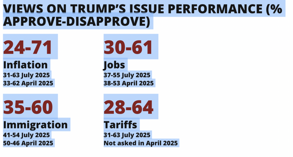 “These latest poll numbers on public approval of President Trump are brutal,” says Jesse Rhodes, professor of political science at UMass Amherst and co-director of the poll. “Fully 62% of Americans somewhat or strongly disapprove of Trump’s job performance. The reason? Americans grade Trump harshly on the most prominent issues facing the country, especially on bread-and-butter economic issues. Seventy-one percent say Trump is not handling inflation well and 61% say he’s not handling the issue of jobs well. Tariffs were supposed to be one of Trump’s signature issues, but they are a public relations disaster with almost two out of three Americans (64%) giving him a negative grade. When it comes to public opinion, economic concerns usually dominate, and Americans’ harshly negative views of Trump’s economic leadership are a major cause of his declining poll numbers.”