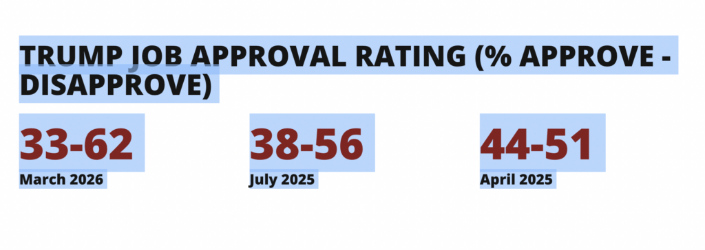 A new national University of Massachusetts Amherst Poll finds President Donald Trump’s approval rating has fallen to 33%, the lowest rating of his second term in office. The poll of 1,000 respondents, conducted March 20-25, finds Trump’s approval down five points from July 2025 and 11 points lower than last April.