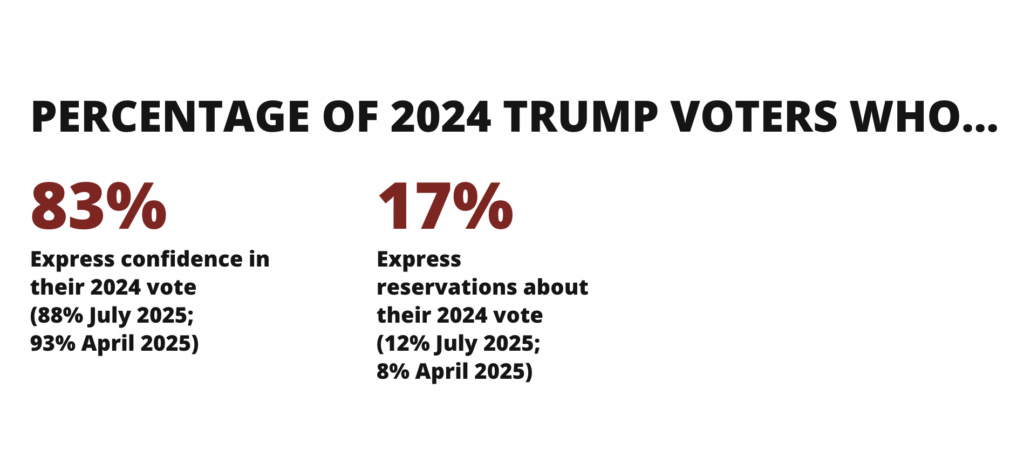 “Are we seeing cracks in the Trump coalition?” Nteta asks. “With much attention being paid to ‘regretful’ Trump voters in the media reports, since April 2025 we have asked Americans to revisit their choice for president in 2024. While we find only a small number (5%) of one-time Trump voters indicating that they regret their vote and would have voted differently, this is up from only 1% of voters in July 2025 and 2% in April 2025 who expressed a similar level of regret. More concerning for President Trump and his allies is the decrease in confidence among Trump voters, with just 62% feeling ‘very confident’ in their vote, a 12-point decrease since April 2025.”
