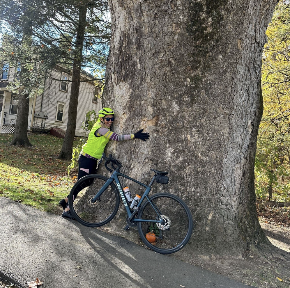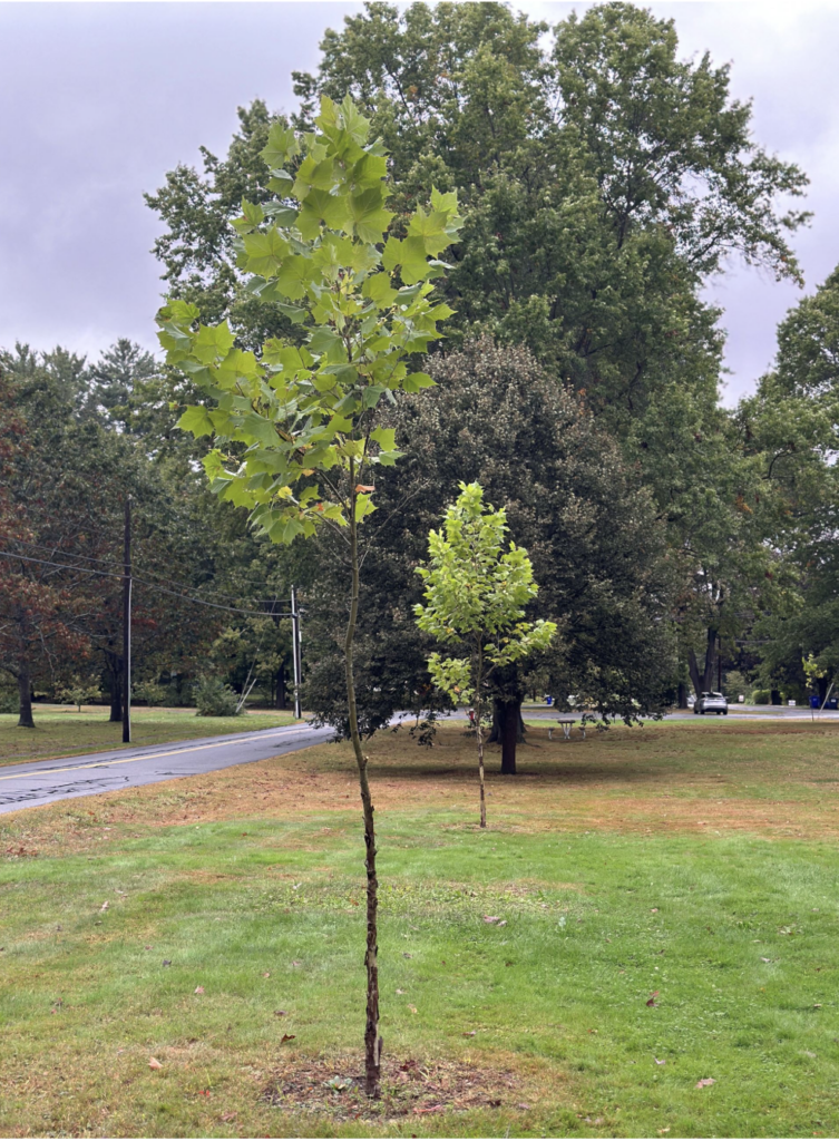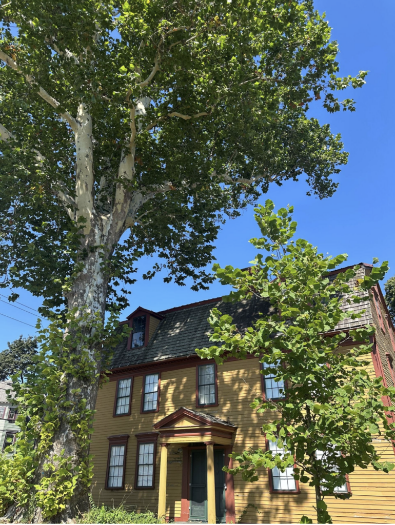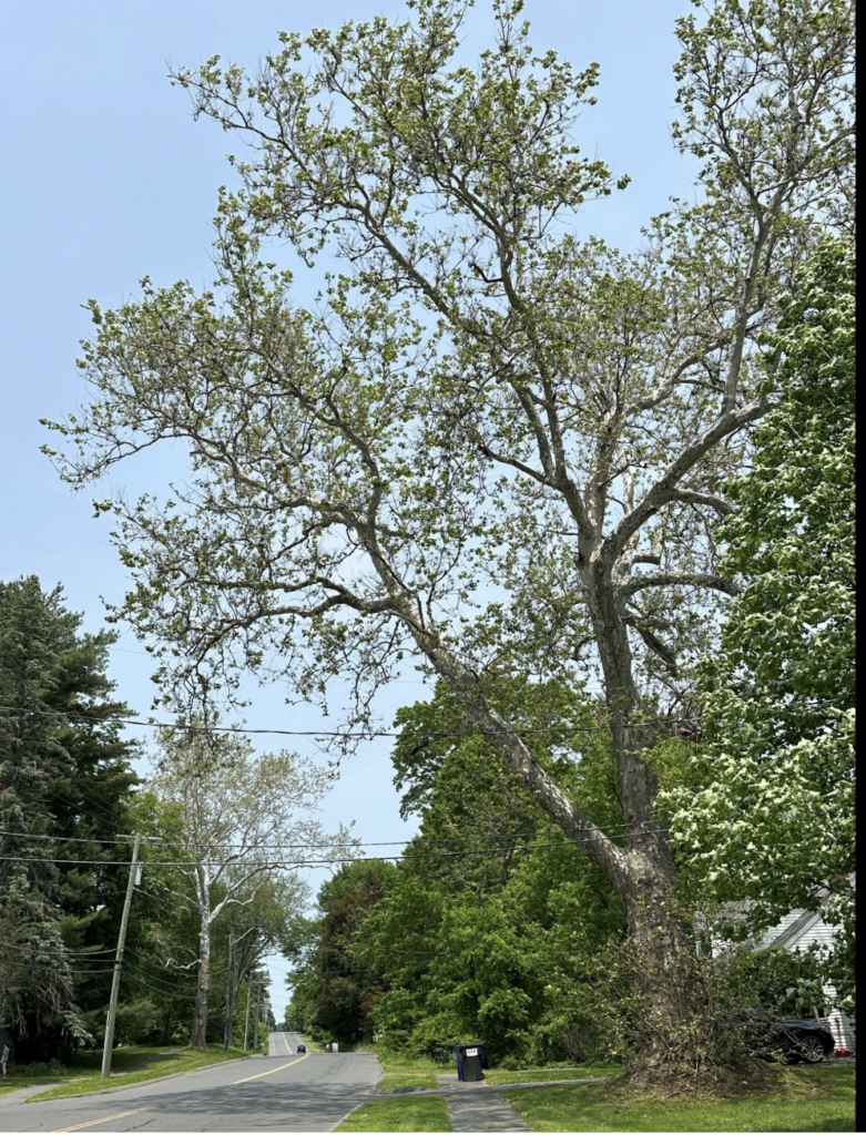 Amherst is home to several historic and noteworthy sycamores. Arguably, the oldest is located at 67 Amity Street, planted in the 18th century by Nehemiah Strong in front of the house he built for his son Simeon at the time of his marriage in 1763. (Today the Strong House, home to the Amherst Historical Society, is one of the oldest structures in town.) Nehemiah planted two sycamores—referred to as “bride and groom” trees—flanking the front door. This was a common practice since the long-lived sycamore symbolized hope for a long marriage. Sadly, after 200 years together, the bride tree succumbed to age and damage from a hurricane; it was removed in 1957. Today, the still-standing groom tree is nearly three centuries old. In 2022, the Massachusetts Department of Conservation and Recreation awarded Amherst a grant to prune and cable the tree’s branches and install lightning protection. The grant also funded the planting of a new bride tree. It will take the bride many years to catch up to her mate, which measures 17-feet in circumference!