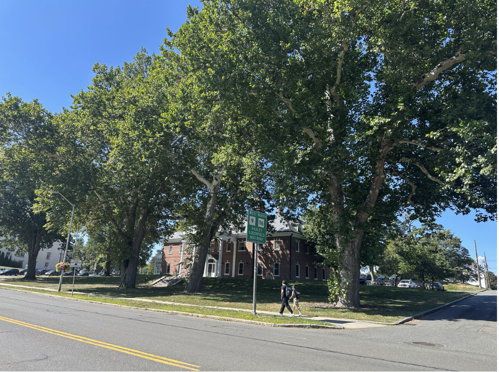 Three enormous American sycamores stand near the intersection of South Pleasant Street and Northampton Road. Photo: Amherst Public Shade Tree Committee