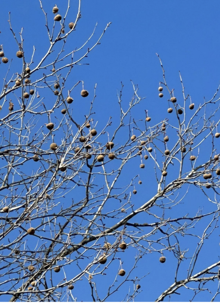 The American sycamore on Pomeroy Court retained hundreds of its “buttonballs” last winter. Each ball consists of numerous, densely packed seed-like fruits.