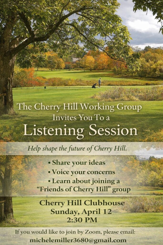 The Cherry Hill Working Group seeks public input on the use of the property and is holding an informal listening session at the clubhouse on Sunday, April 12 at 2:30 p.m. The group is looking for interested people go share ideas, voice concerns, and explore the idea of a “Friends of Cherry Hill” group. Participation over Zoom will also be offered (email michelemiller3680@gmail.com for the link).