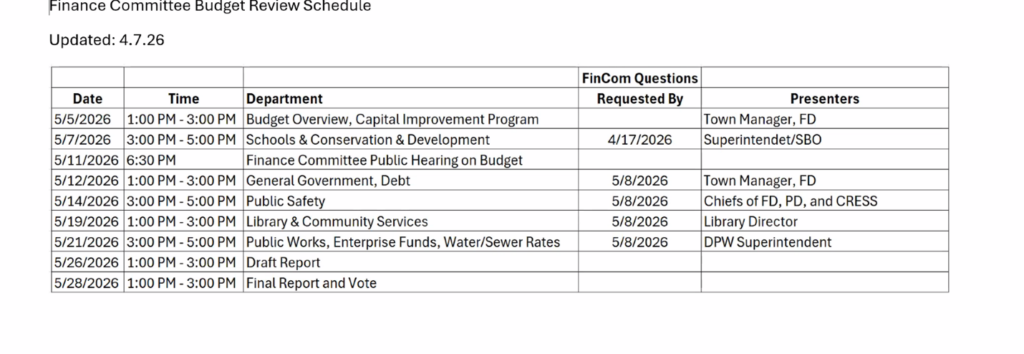 The Finance Committee agreed on the following schedule to evaluate the Town Manager’s proposed budget. The committee will meet every Tuesday and Thursday in May. The Thursday meetings were moved to 3:30 p.m., except for the May 7 meeting on the elementary school budget, which will begin at 3 p.m.
