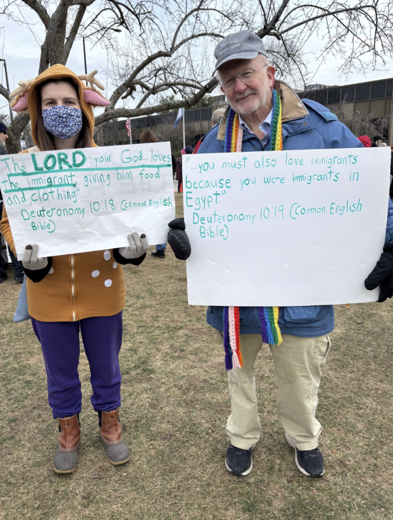 I really appreciated the dominant tone of this gathering. I found the same high spirits and friendliness that I had at other rallies, but fewer jokes and insults on the signs. While I recognize that rude jokes about the administration play an important role in resistance, as a protester, I always—naively—hope that some non-supporter walking by will see a sign and realize, “Oh—these people are in favor of the Constitution! These people support democracy! So do I!” The Burlington organizers emphasize, in their opening remarks and on their website, their commitment to non-violence and their focus on immigrants. Throughout the gathering I felt an overall focus on the suffering of our immigrant neighbors and the claim that makes on our consciences.