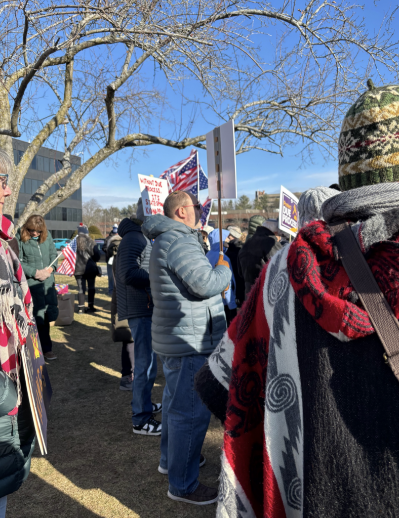 The weekly Wednesday, 11:00 a.m. – 1:00 p.m. protests were started in April of last year by one couple, Laurie and Jared Berezin, and the crowds have grown to as many as 750 participants. On December 10, fifty of us from western Massachusetts joined 450 local people in Burlington.