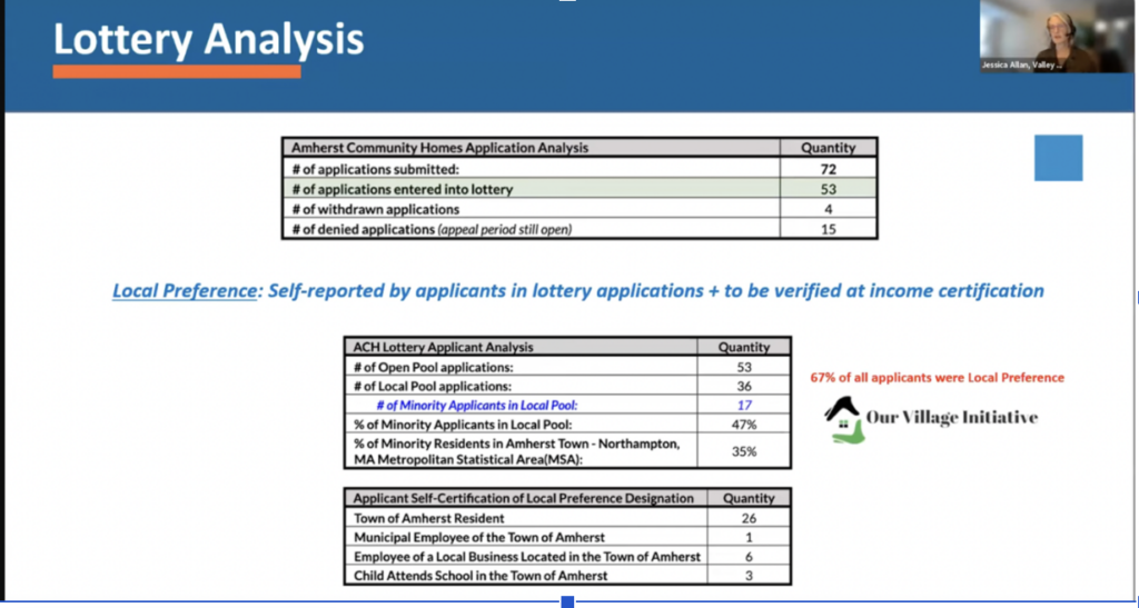 Of the 53 qualified applicants, 36, or 67%, met the terms for local preference. Twenty-six were Amherst residents, one was a town employee, six worked for local businesses, and three had children in the schools. Seventeen — 47% of the local pool — were minorities. Allan cautioned that the statistics are based on self-certification and will be verified by CHAPA before homeowners are chosen. She also commended the financial consulting firm and local residents for their outreach to Amherst’s BIPOC community.